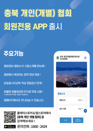 회원님들의 편의를 위해 충북 개인개별화물협회 회원전용 APP을 출시하였습니다.